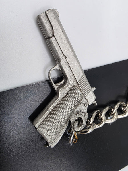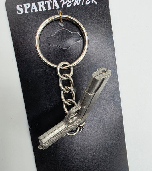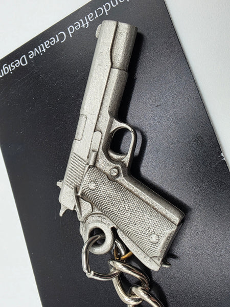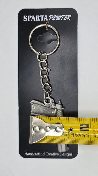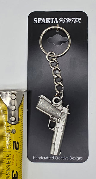 Colt 1911 3D pewter keychain. Measures about 4 1/2 inches long (including keyring and chain). The Colt 1911 measures approximately 1 inch tall by approximately 2 inches in length.