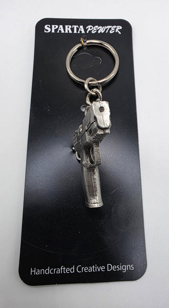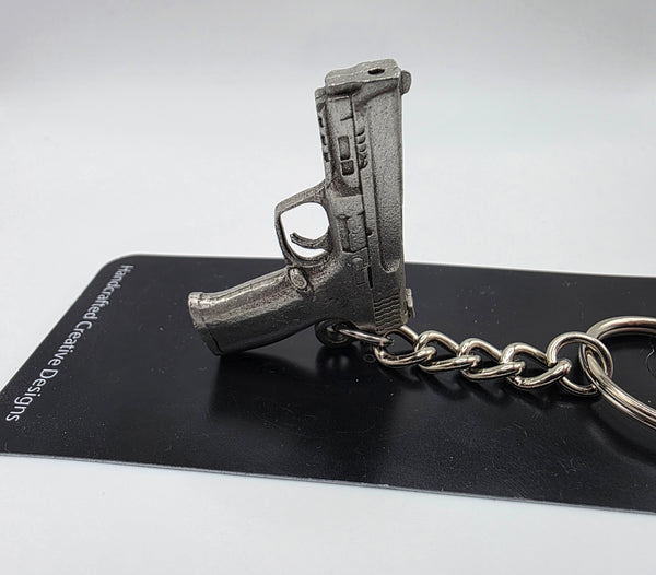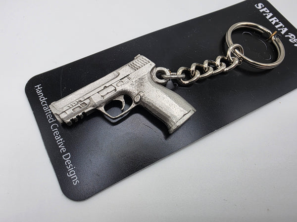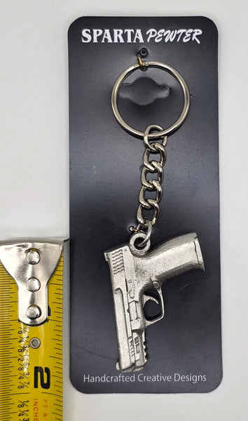 Smith & Wesson M&P 9 3D pewter keychain. Measures about 4 1/4 inches long (including keyring and chain). The Smith & Wesson M&P 9 measures approximately 1 1/4 inch tall by approximately 1 3/4 inches in length.