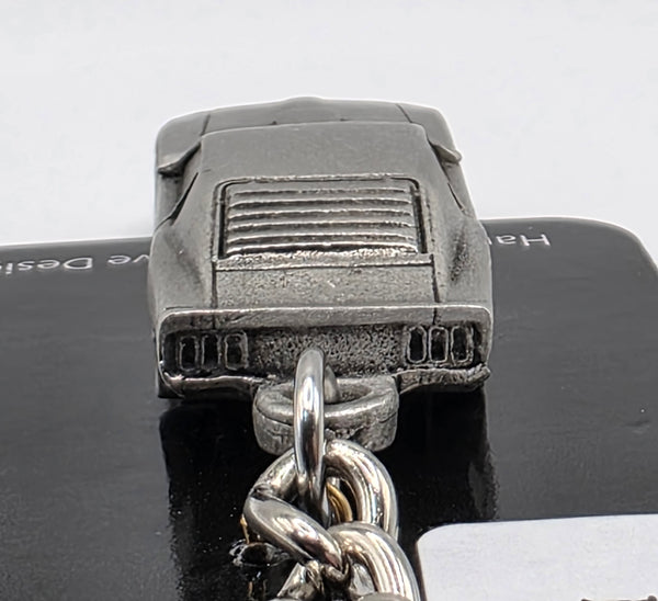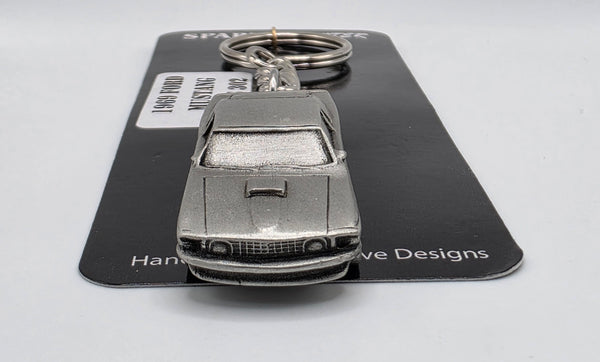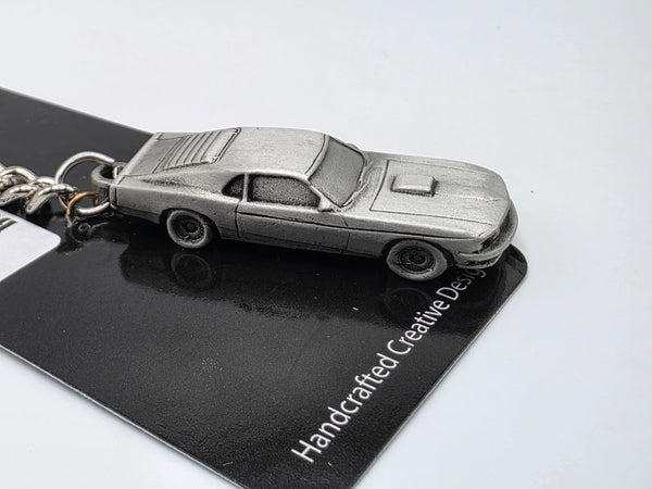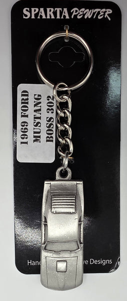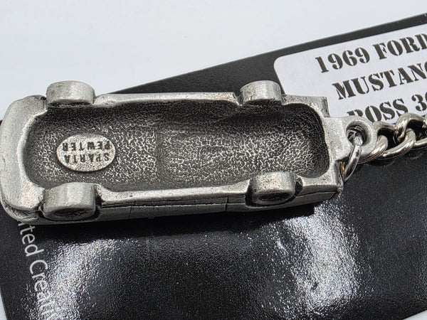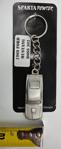1969 Ford Mustang Boss 302 3D pewter keychain. Measures about 5 inches long (including keyring and chain). The Ford Mustang Boss 302 3D measures approximately 2 1/4 inches in length and approximately 3/4 inch in width.